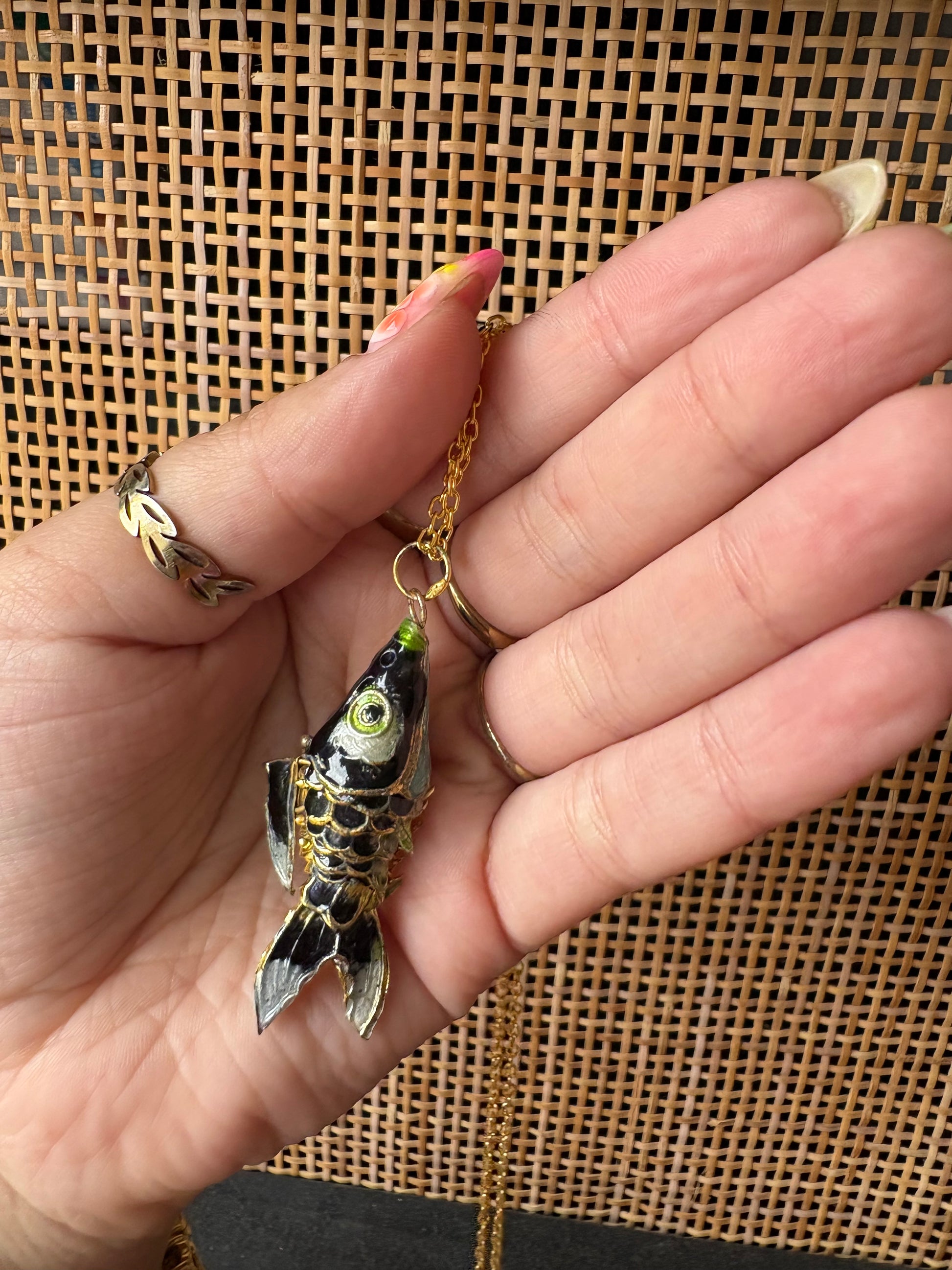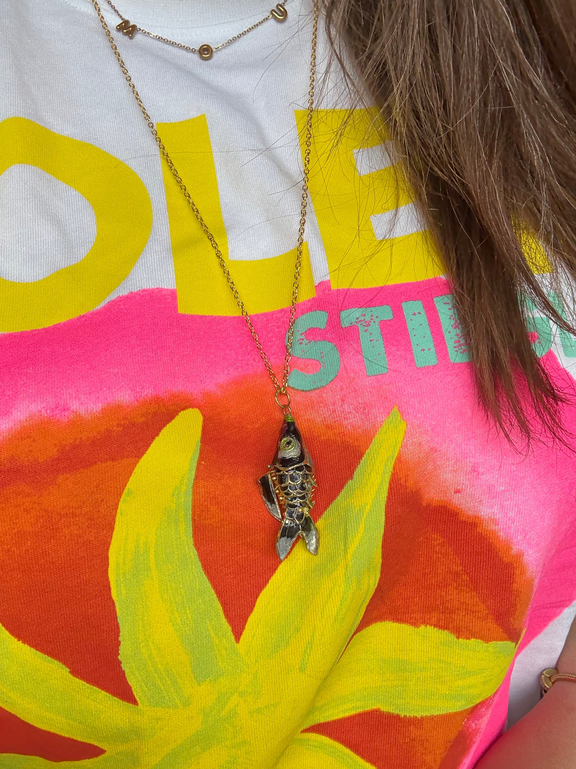 Prachtige handgemaakte vis bedel aan een lange rvs ketting.