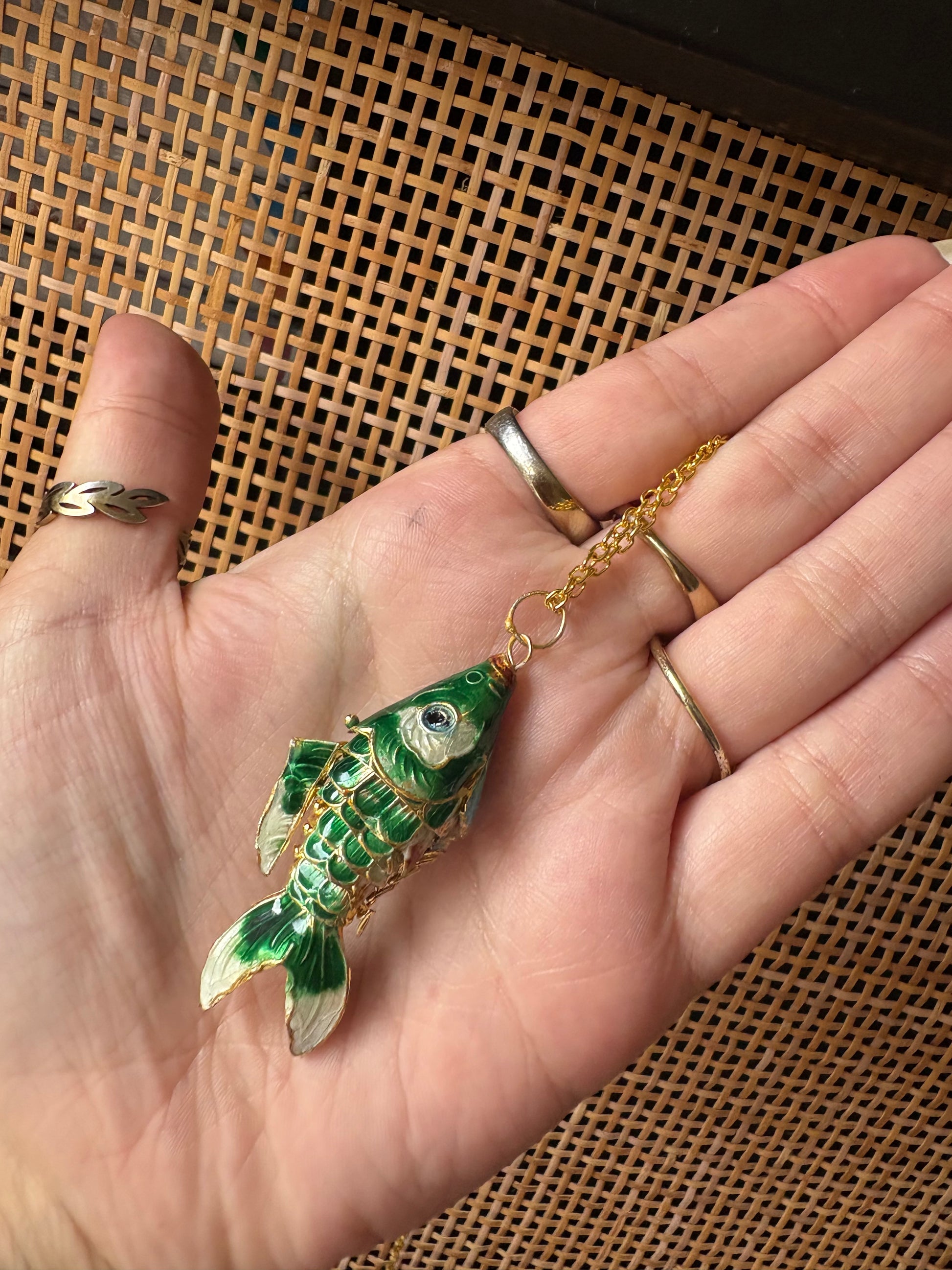 Prachtige handgemaakte vis bedel aan een lange rvs ketting.