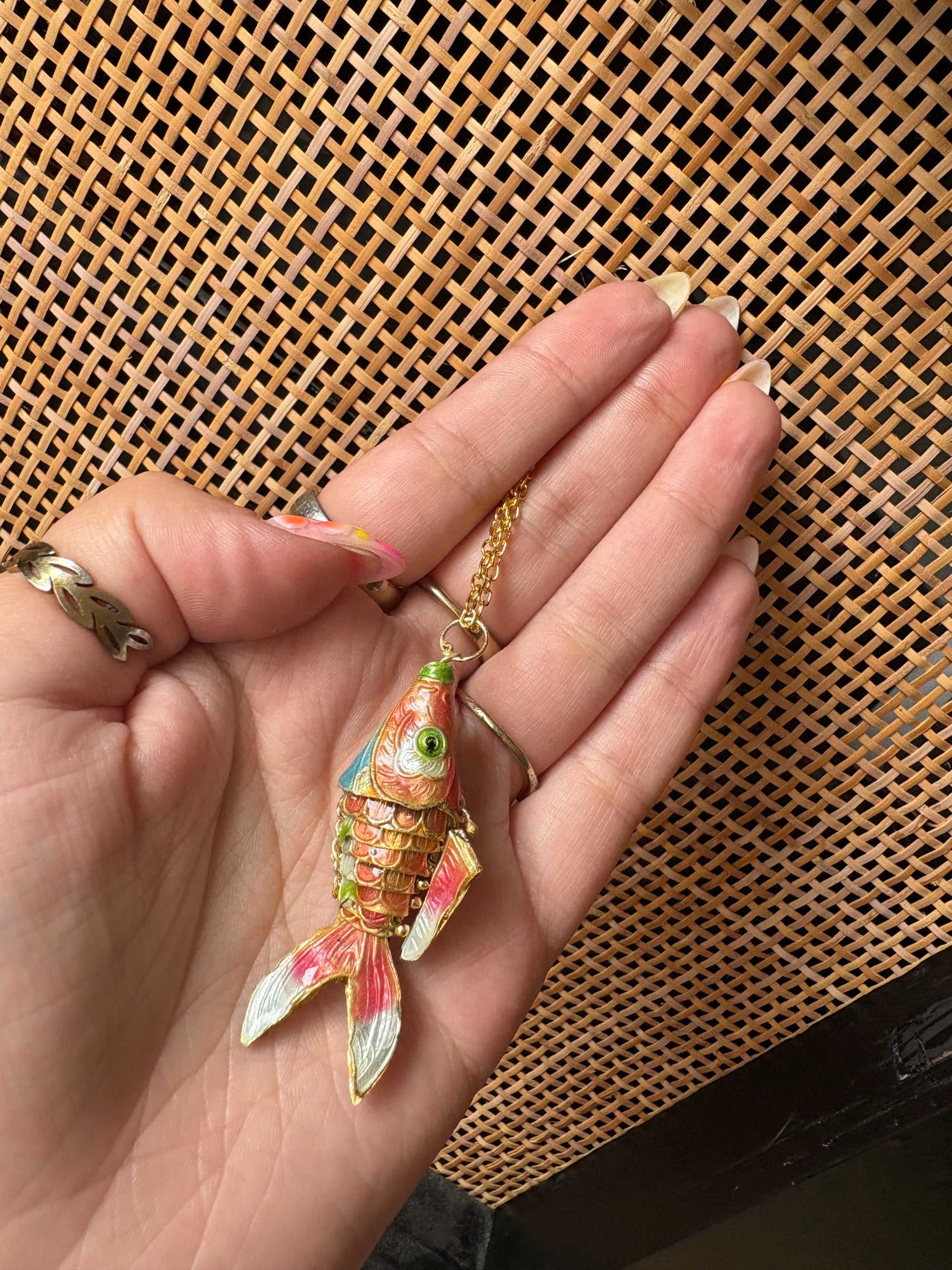 Prachtige handgemaakte vis bedel aan een lange rvs ketting.