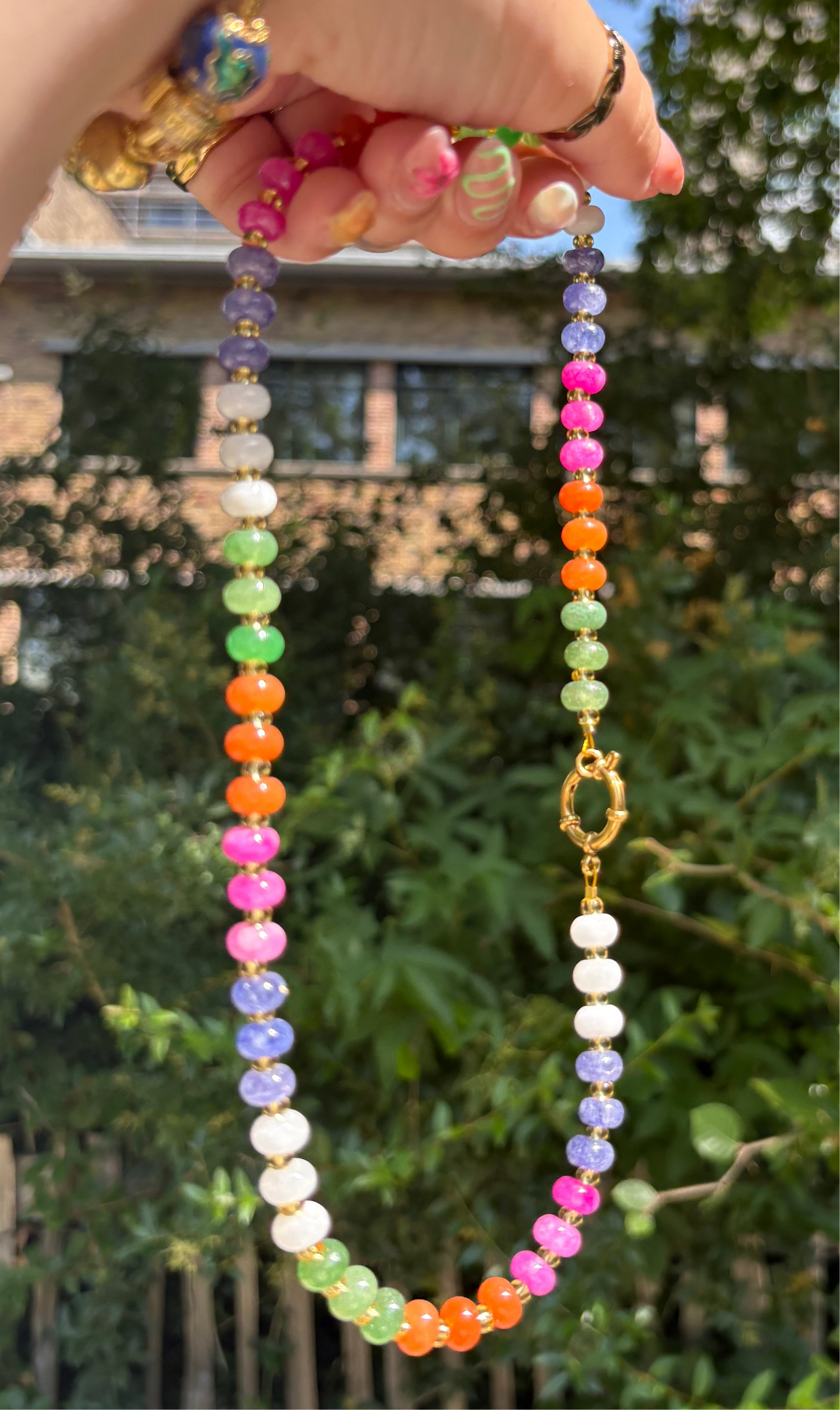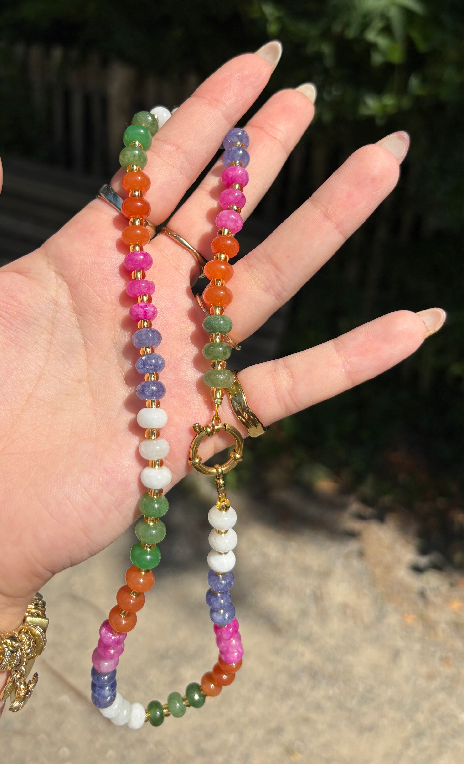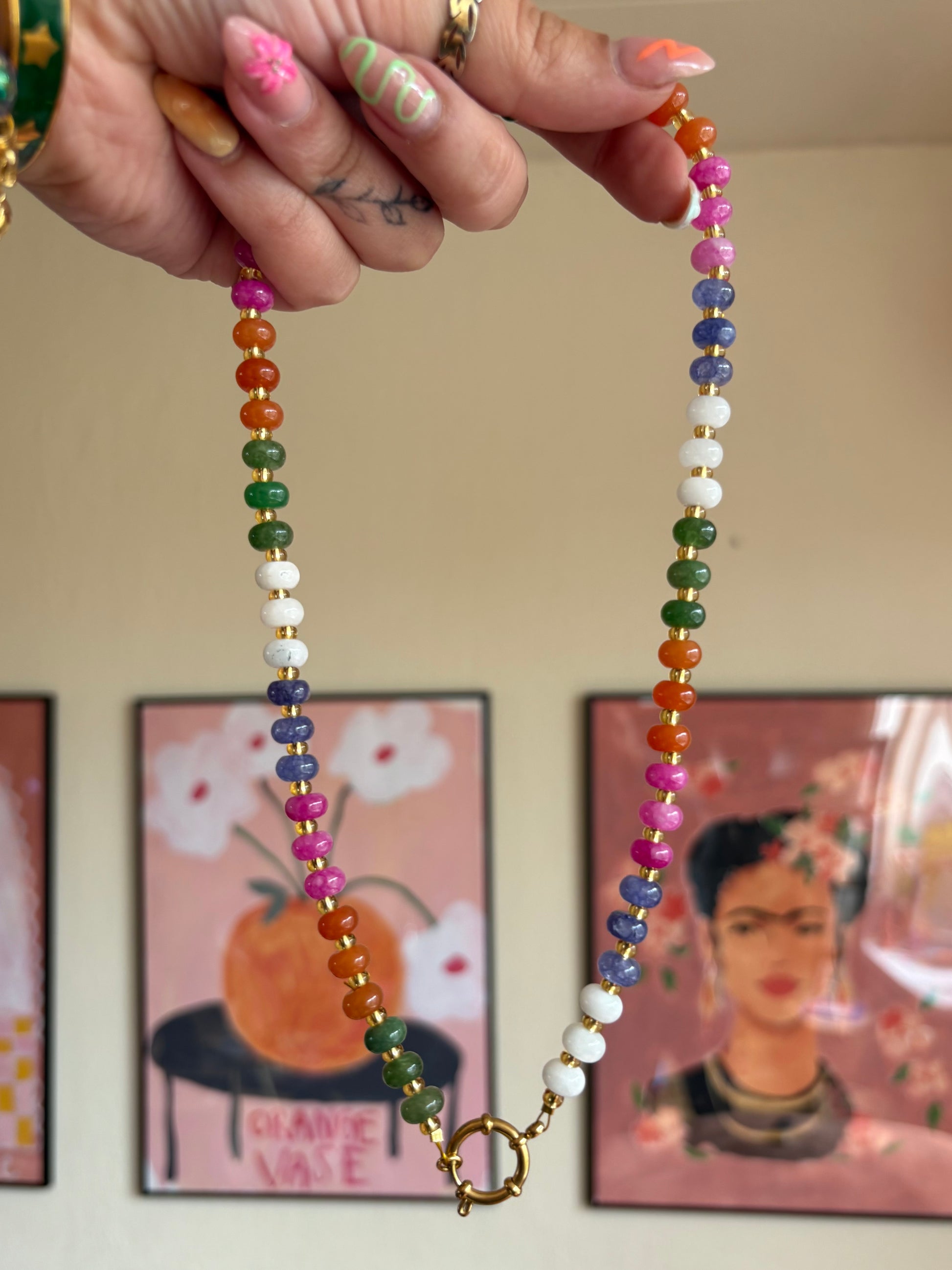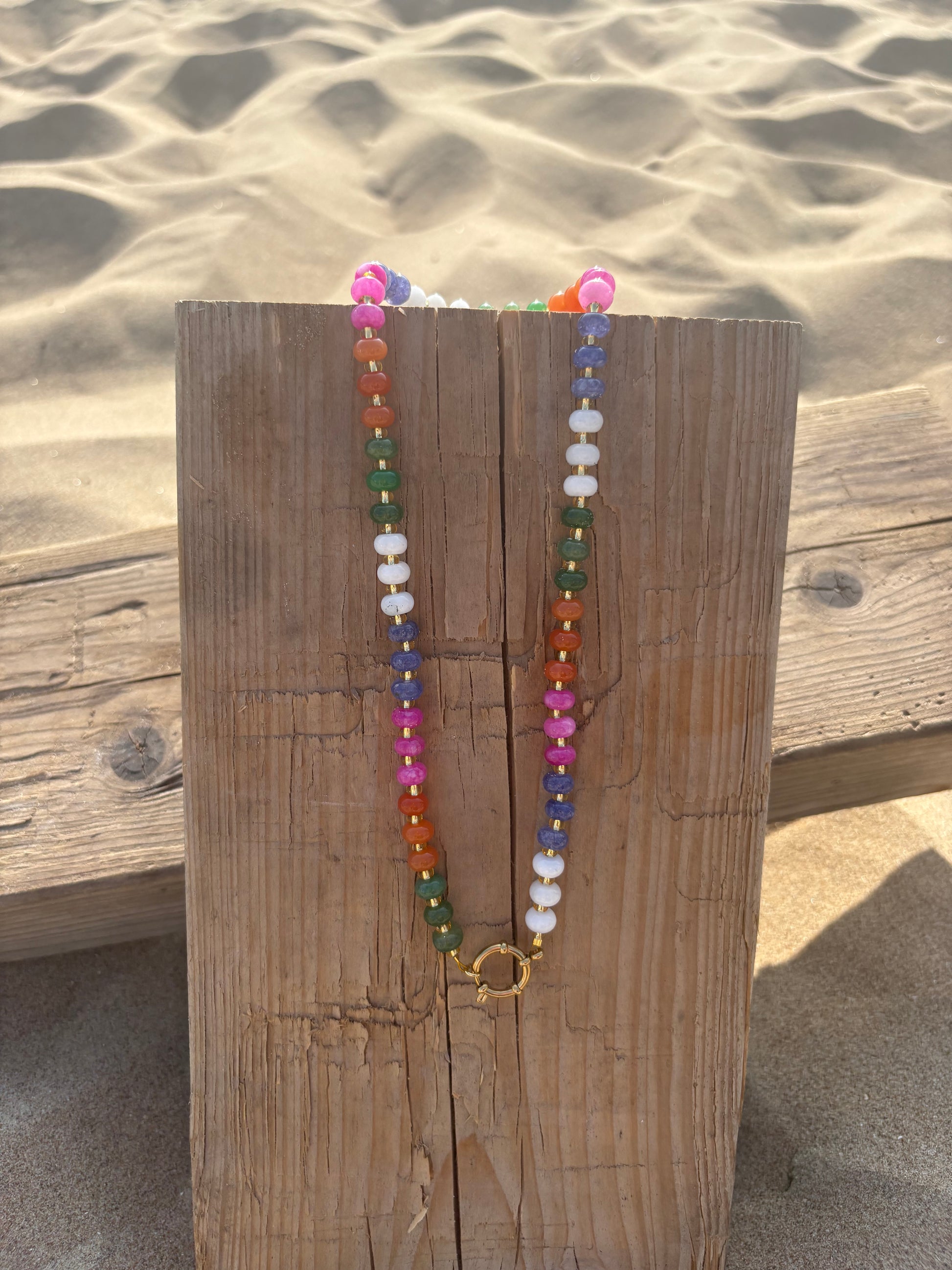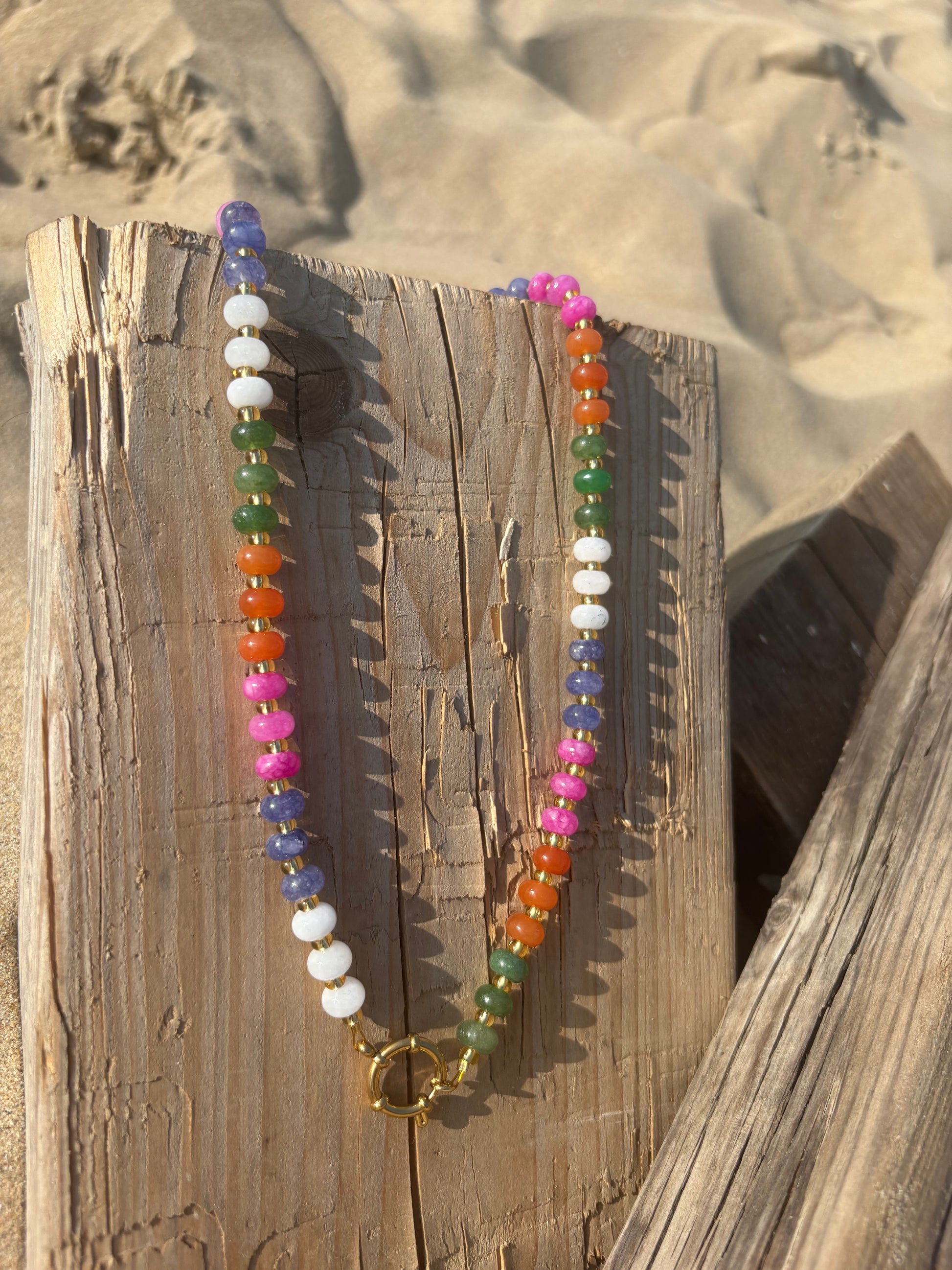 Geef je look een instant mood boost met deze kleurrijke ketting van glaskralen! Deze vrolijke eyecatcher mixt heldere tinten met speelse vormen en laat je outfit stralen – of je nu op een festival danst, op het terras zit of gewoon je dagelijkse look wat extra kleur wilt geven.