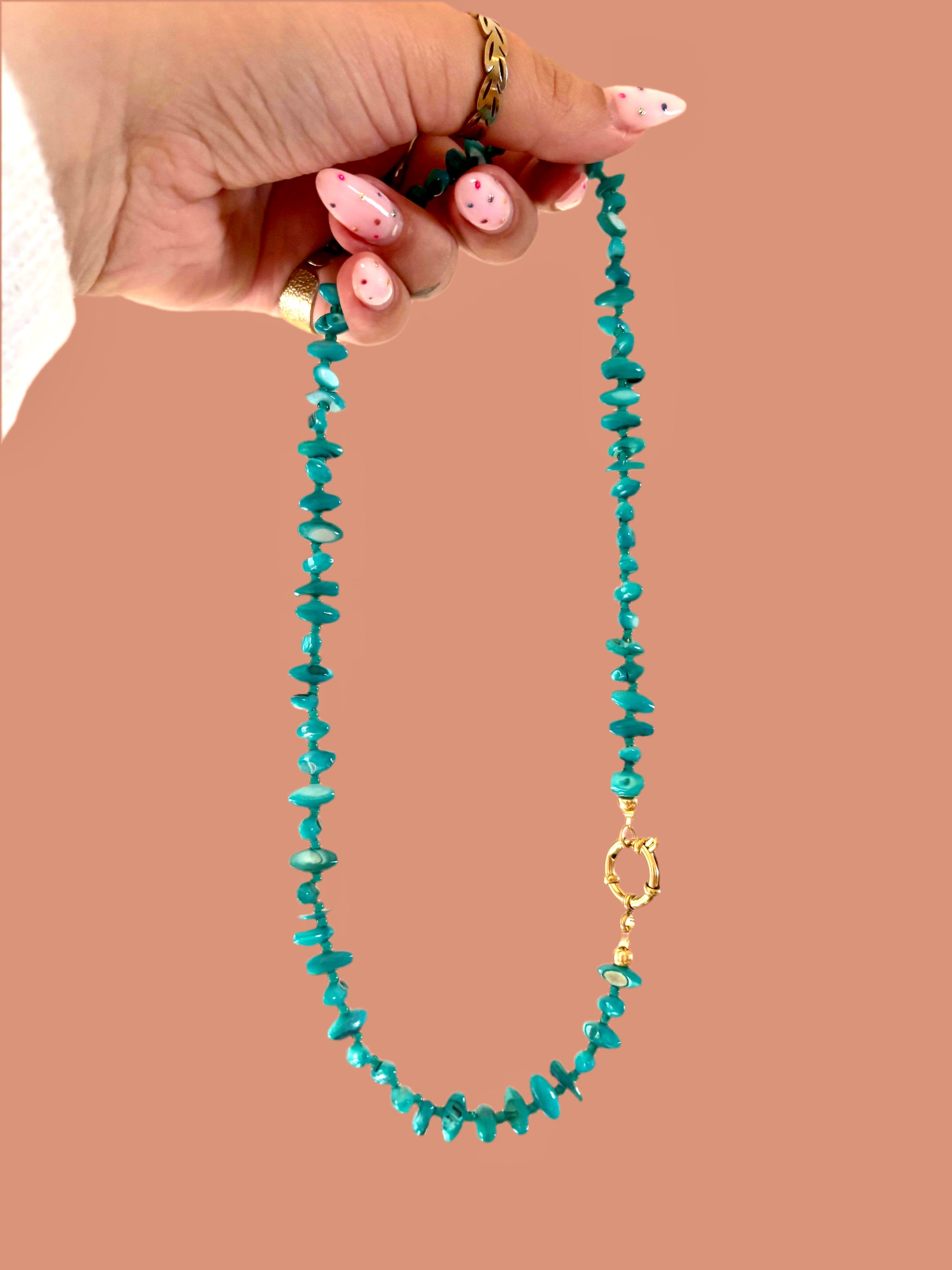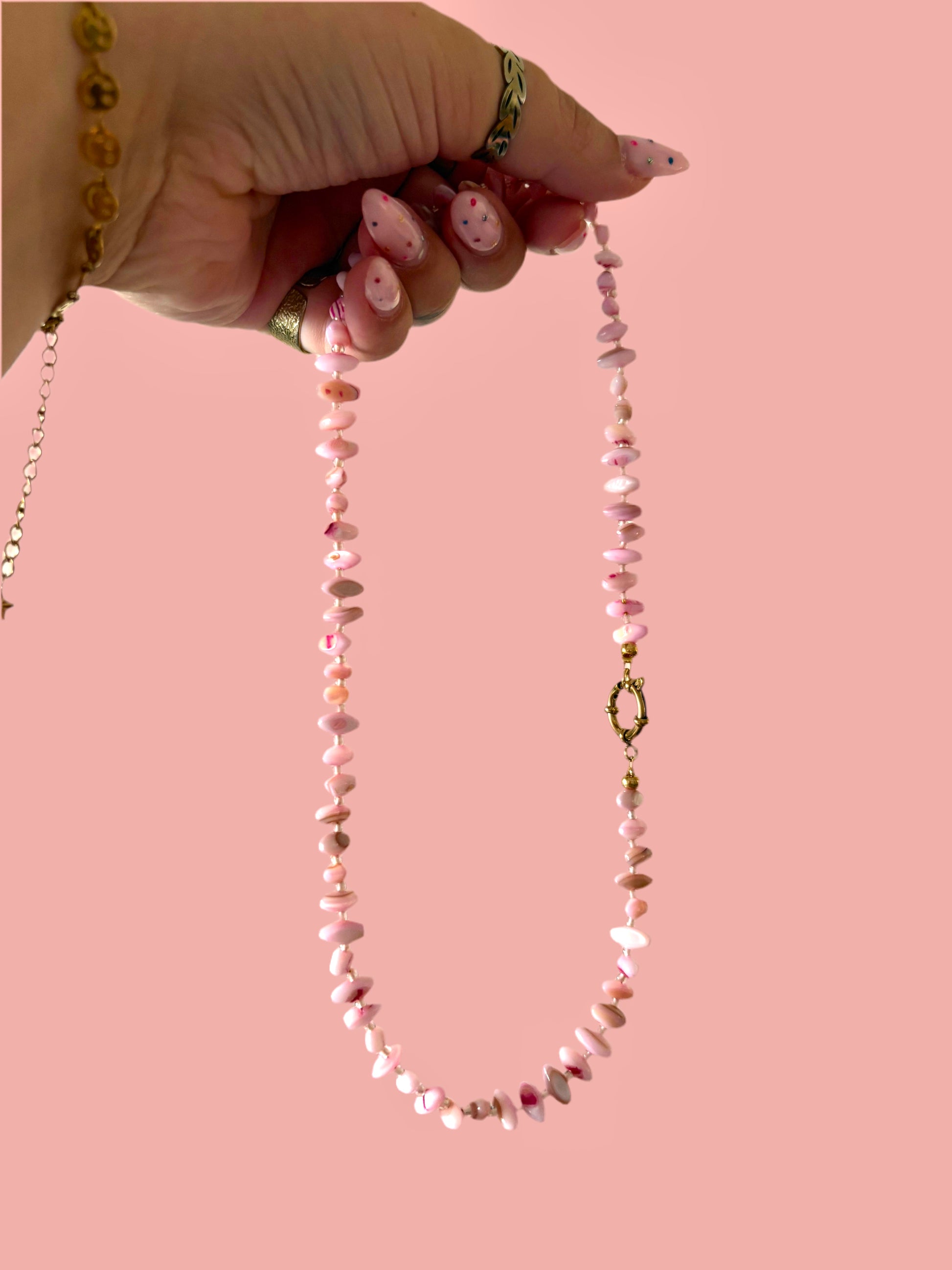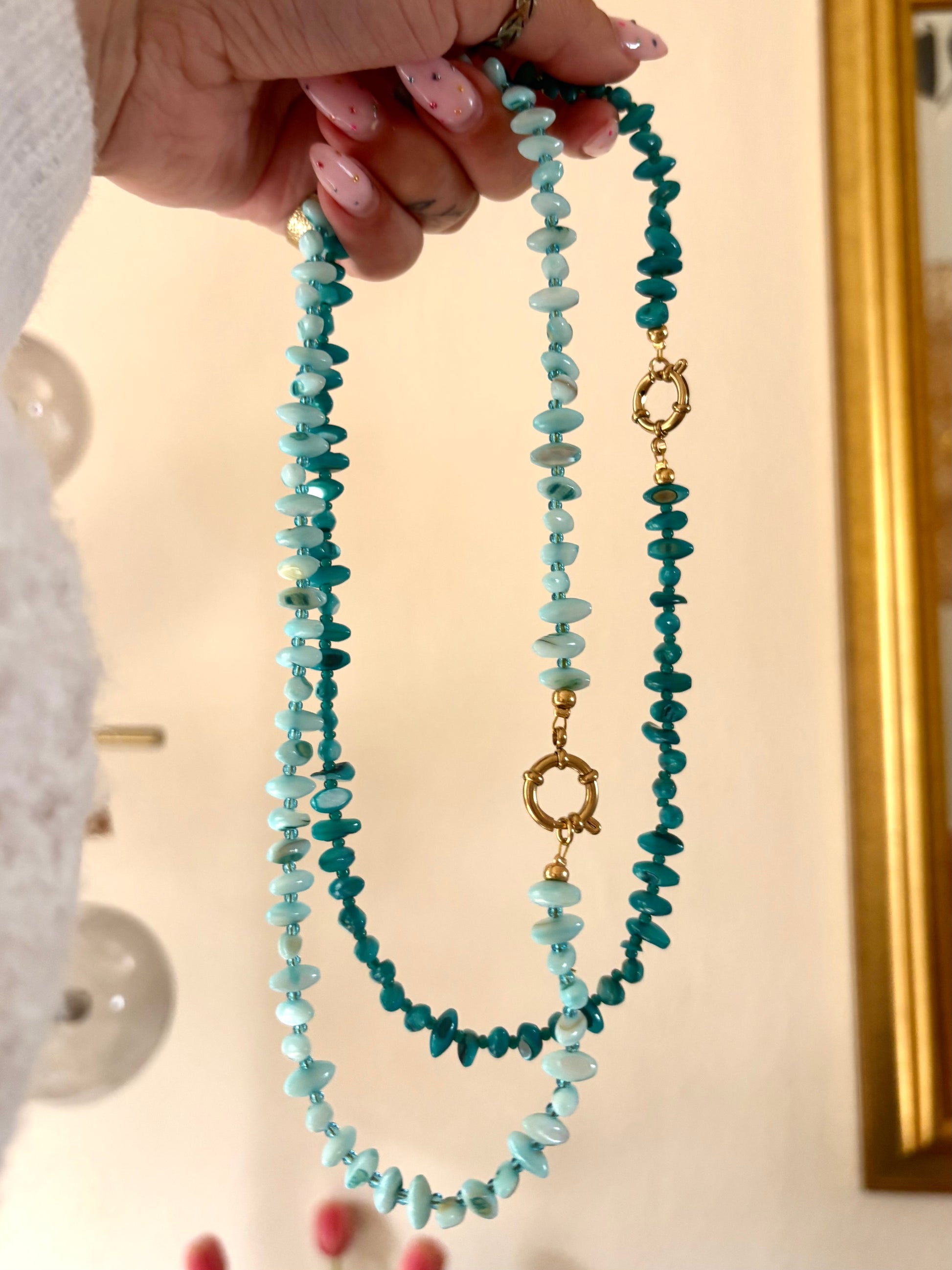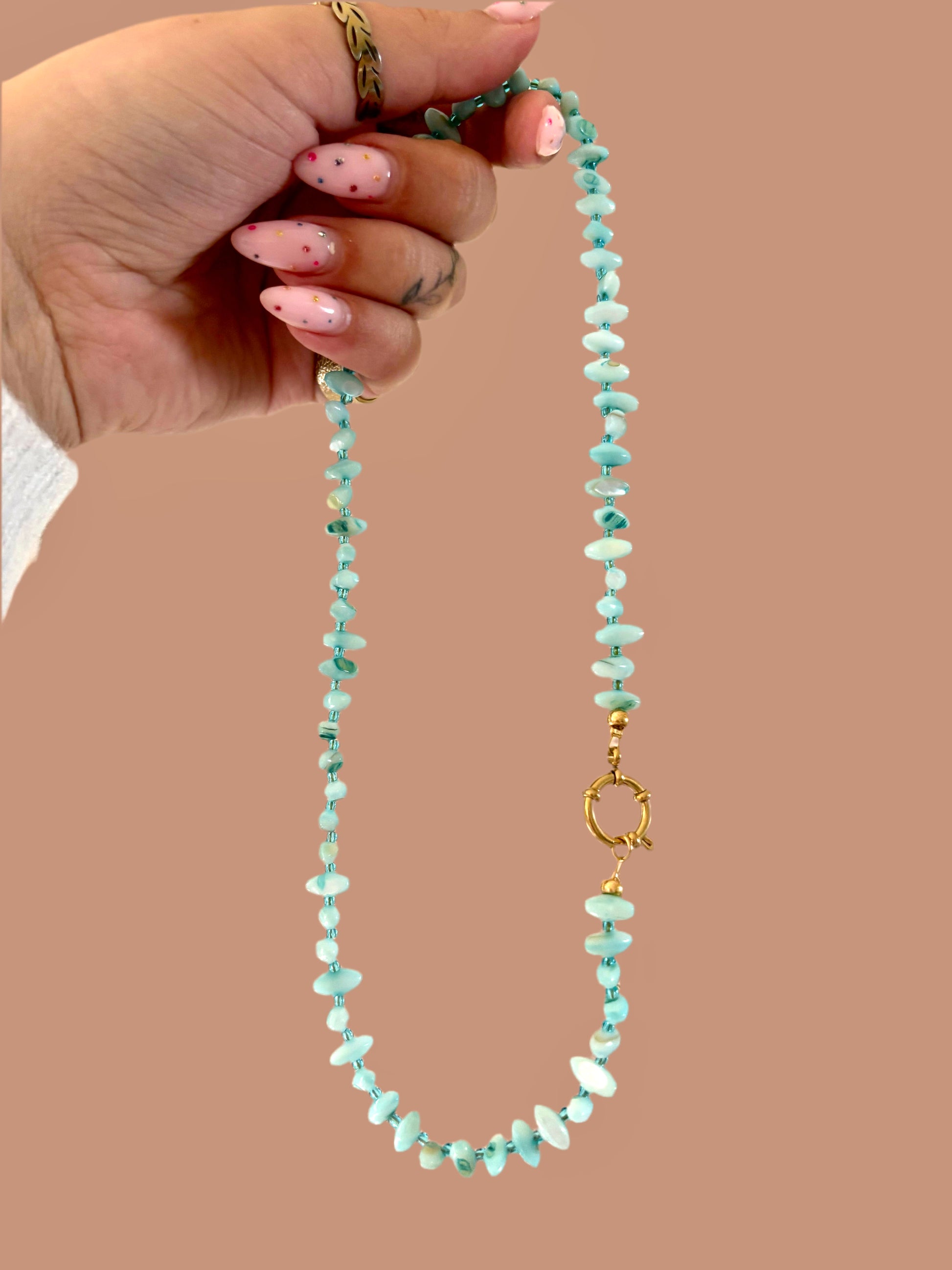 Prachtige ketting gemaakt van glas en schelp kralen. Mooie stevige kralen met parelmoer glans.
