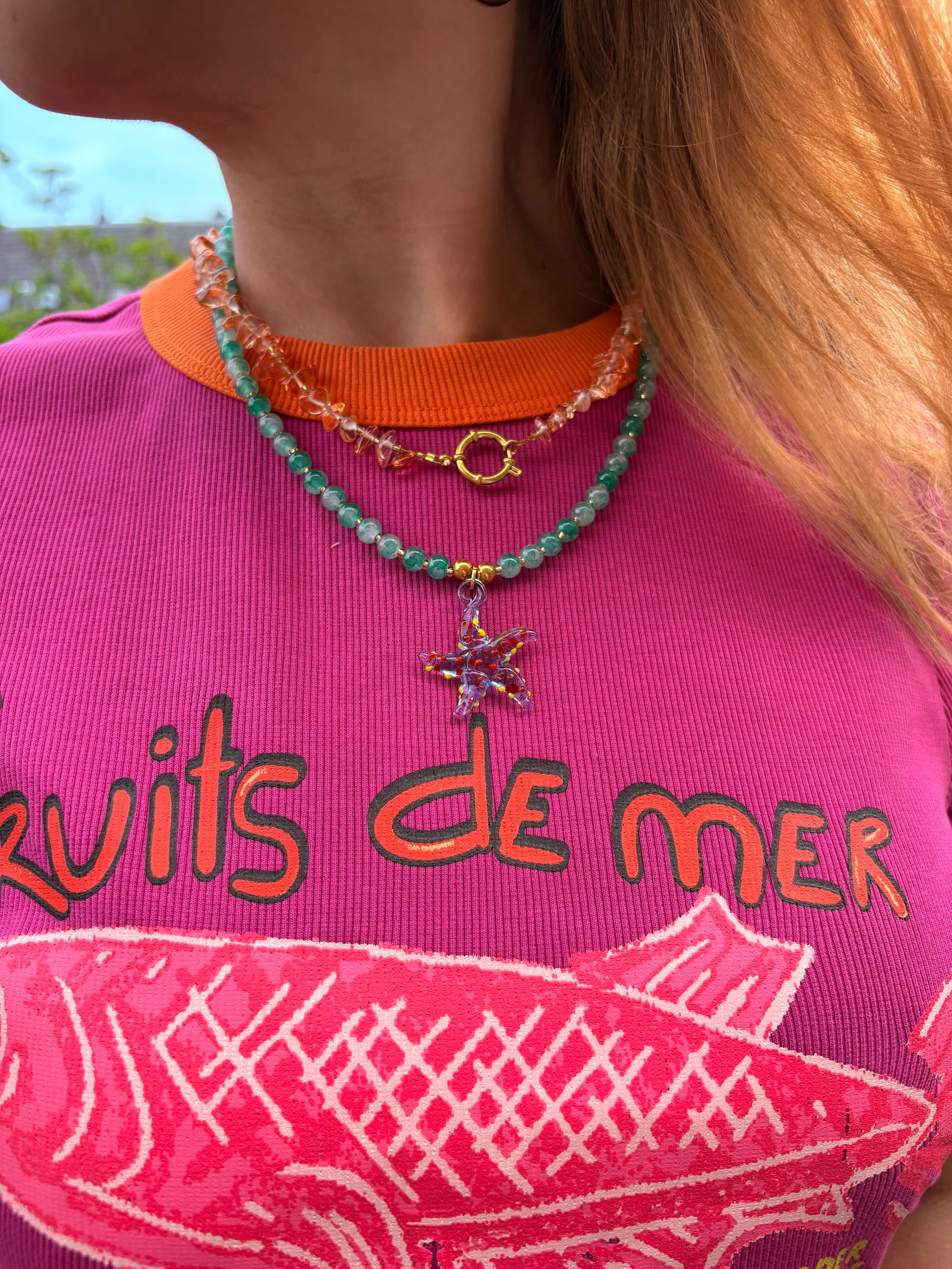Duik in de magie van de zee met deze glazen zeester ketting – een sprankelend sieraad vol zomerse vibes! De handgemaakte glazen hanger in de vorm van een vrolijke zeester geeft je outfit meteen een speels en oceaanfris accent.