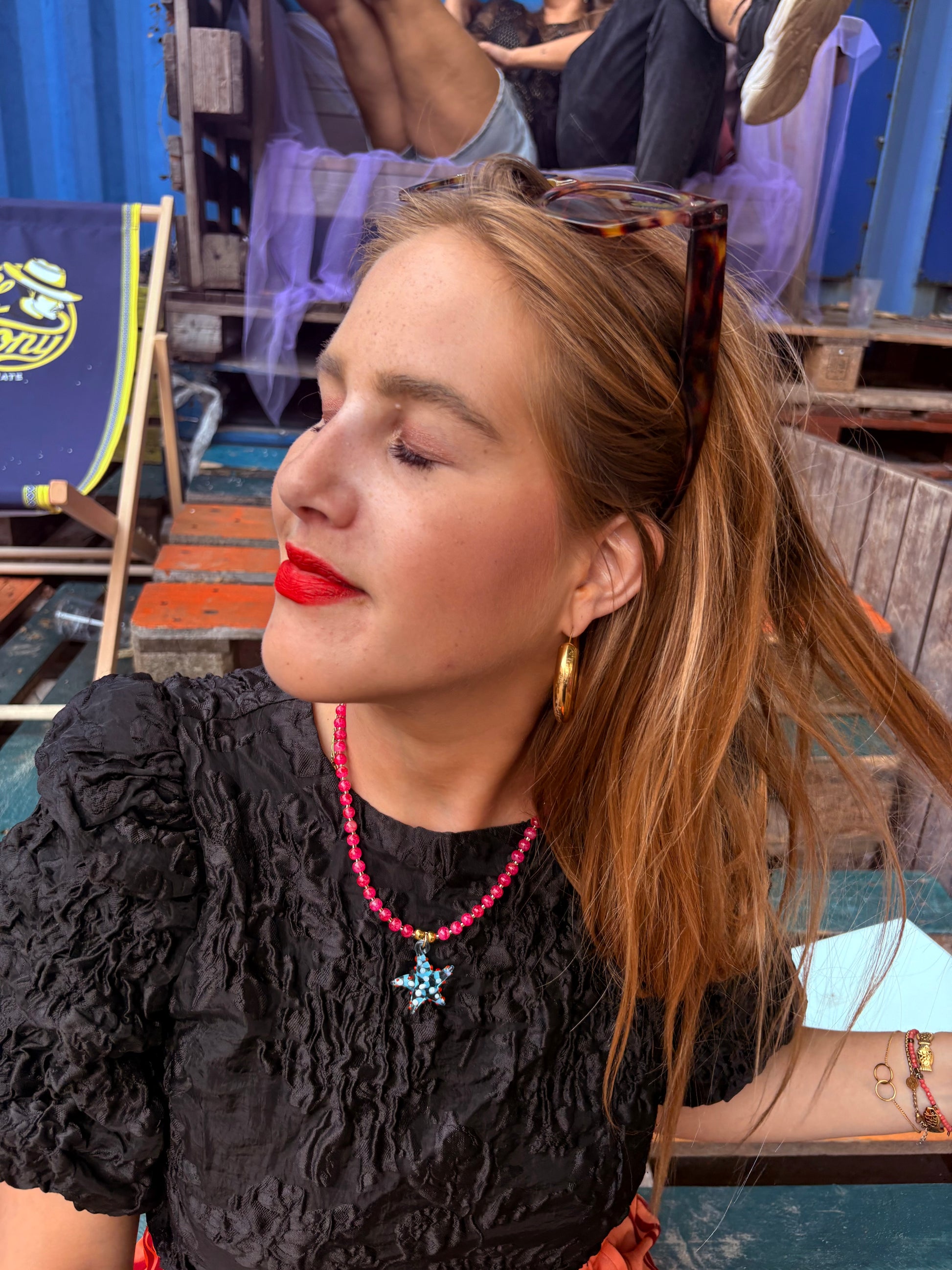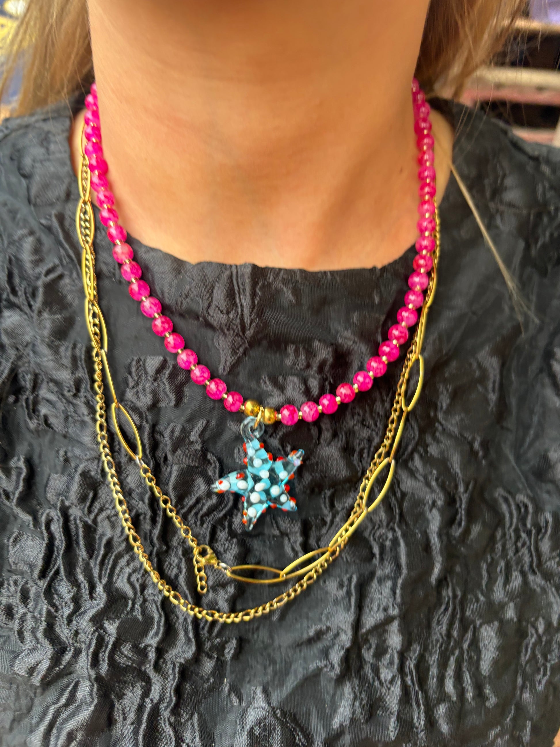 Dompel jezelf onder in zomerse sferen met deze betoverende ketting, geïnspireerd op het kleurenspel van de zee. De ketting is met de hand geregen.